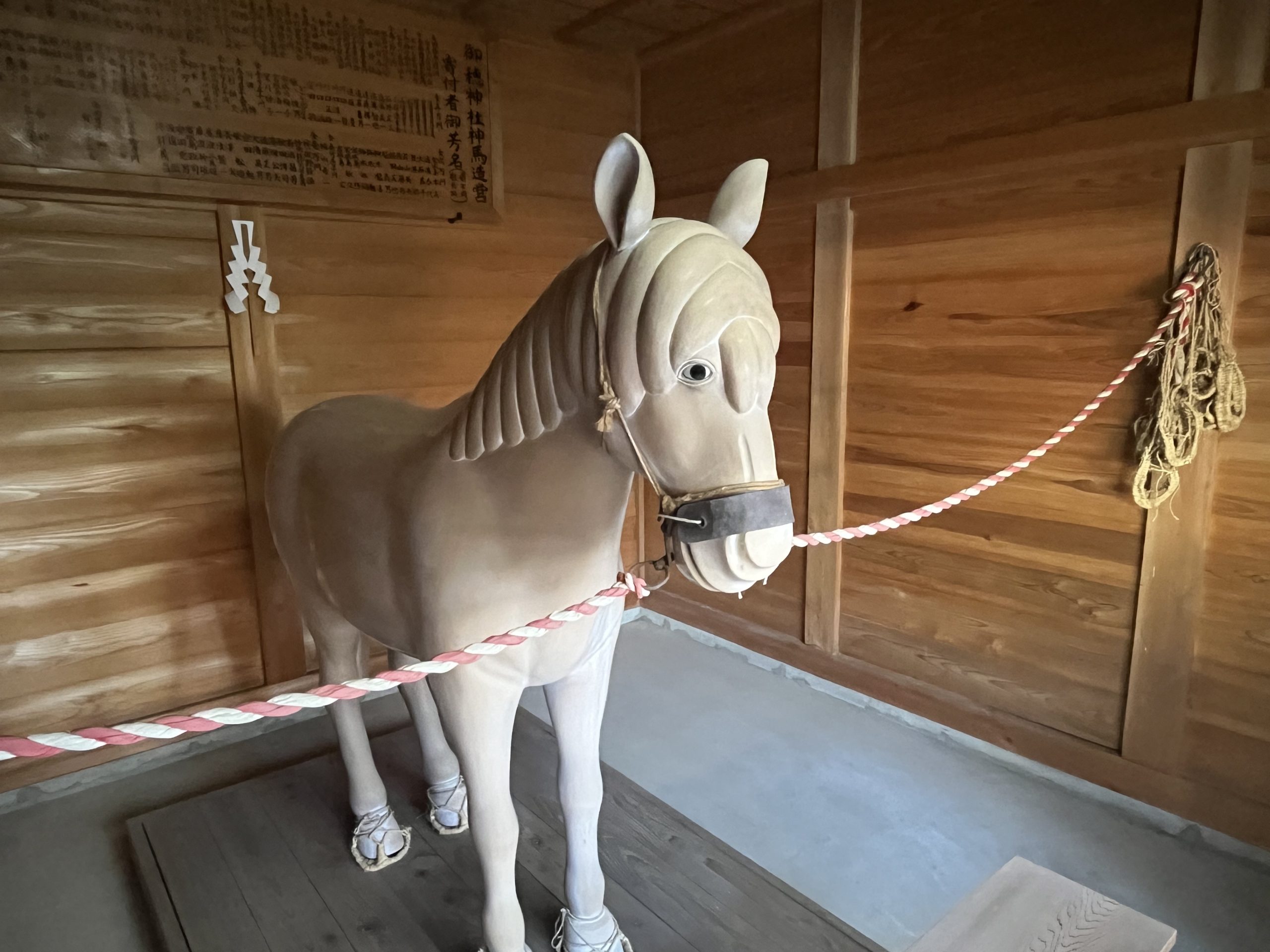 鎌倉時代には、源頼朝が神馬を奉納し流鏑馬を行うなど、御穂神社と神馬は大変ゆかり深いです。 - この白い神馬は、安永二年(1773)駿府大火で静岡浅間神社の二頭の神馬が当神社に逃げ、一頭は残り一頭は戻ったと伝えられています。ちゃっきり節にも唄われ、当初、名匠左甚五郎の作だったと伝わります。
