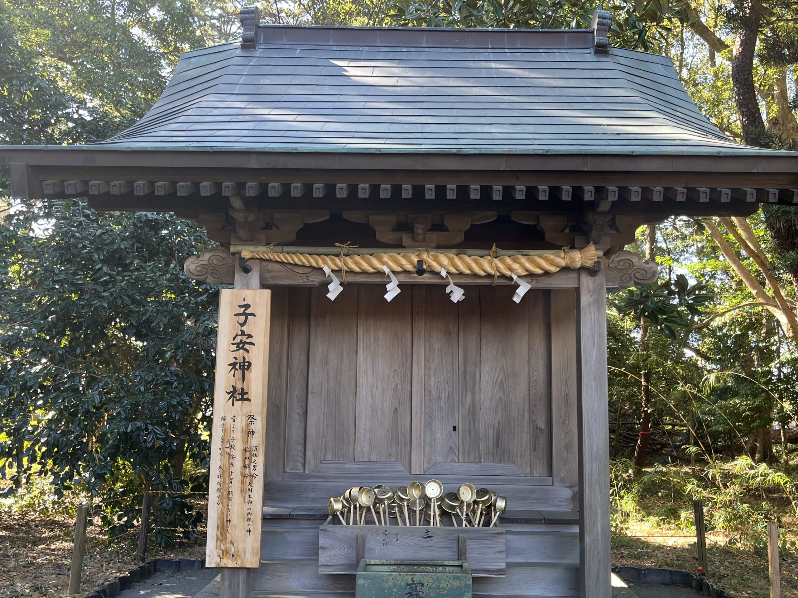 - 昔から安産の祈願・御礼参りとして穴の空いた柄杓を奉納する風習があり、水がつかえず軽く抜ける如くに楽なお産が出来ますようにとの願いが託されています。