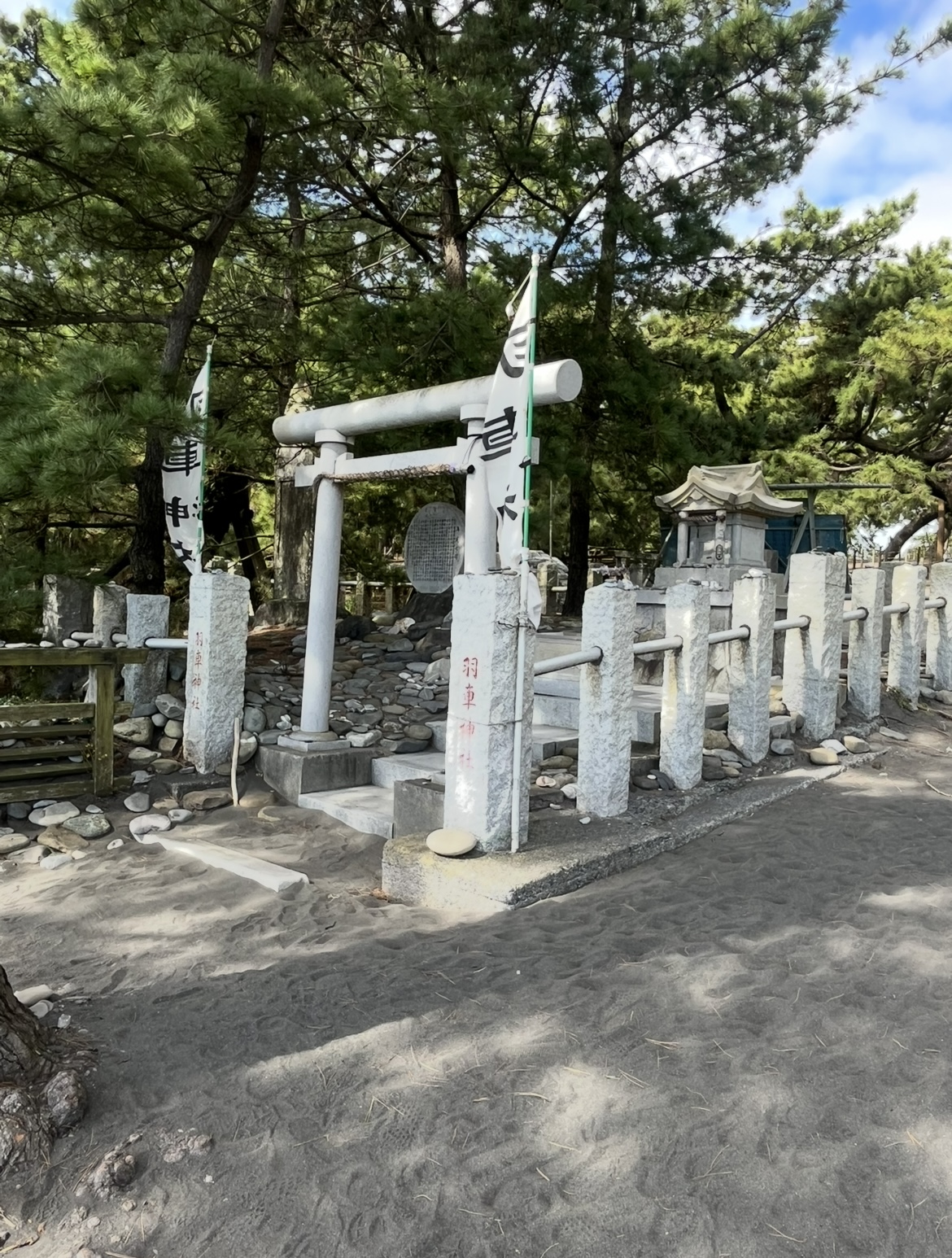 - 慶応三年(1650)の古地図には鳥居の姿が確認できます。元禄十六年(1703)の『駿河巡見帳(駿河目付三島清左衛門)』には「磯ぎわの松原入口に、三保明神への道しるべの杭木が左右にたつ」とあり、時代によって変遷があったといえます。
