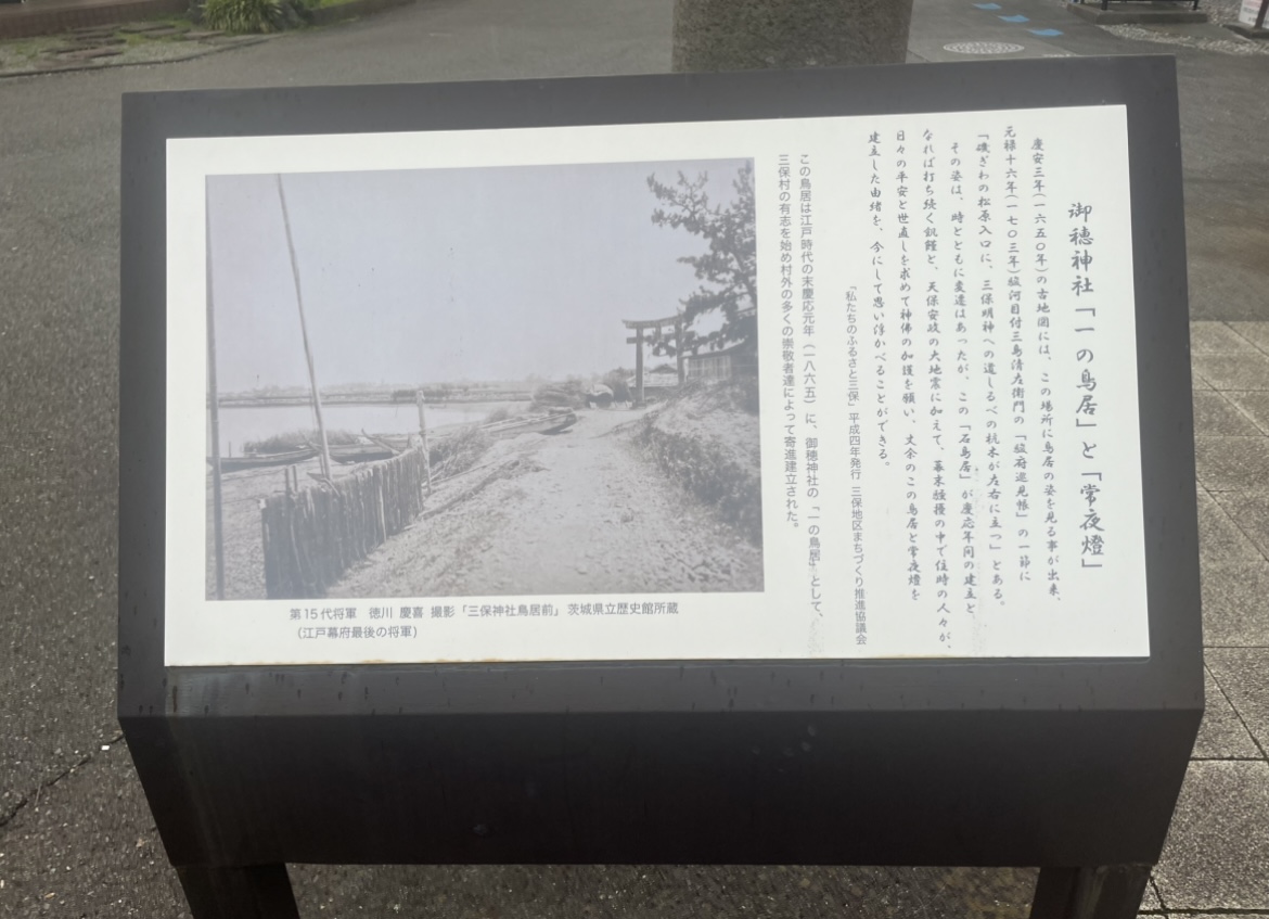 - 第十五代将軍徳川慶喜の撮影した写真に写っている鳥居は、慶応元年(1865)に三保村の有志始め崇敬者たちによって建立されたものです。